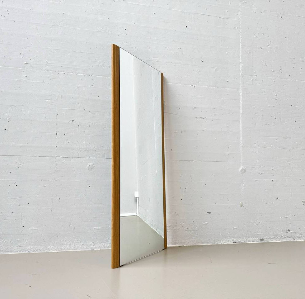 Schlichter Wandspiegel des Schweizer Herstellers VEGLA aus der Mitte des 20. Jahrhunderts. Der Spiegel ist in einen geradlinigen Holzrahmen eingefasst, der dem Entwurf eine warme, reduzierte Anmutung verleiht. Auf der Rückseite befindet sich die originale Herstellerprägung VEGLA – Gütezeichen RAL, ein typisches Qualitätsmerkmal industrieller Schweizer Fertigung. Die klare Form und das schlanke Profil machen den Spiegel vielseitig einsetzbar, sei es im Eingangsbereich, Schlafzimmer oder als funktionales Gestaltungselement im Wohnraum. Ein zeitloses Objekt mit ruhiger Präsenz und authentischem Vintage-Charakter.