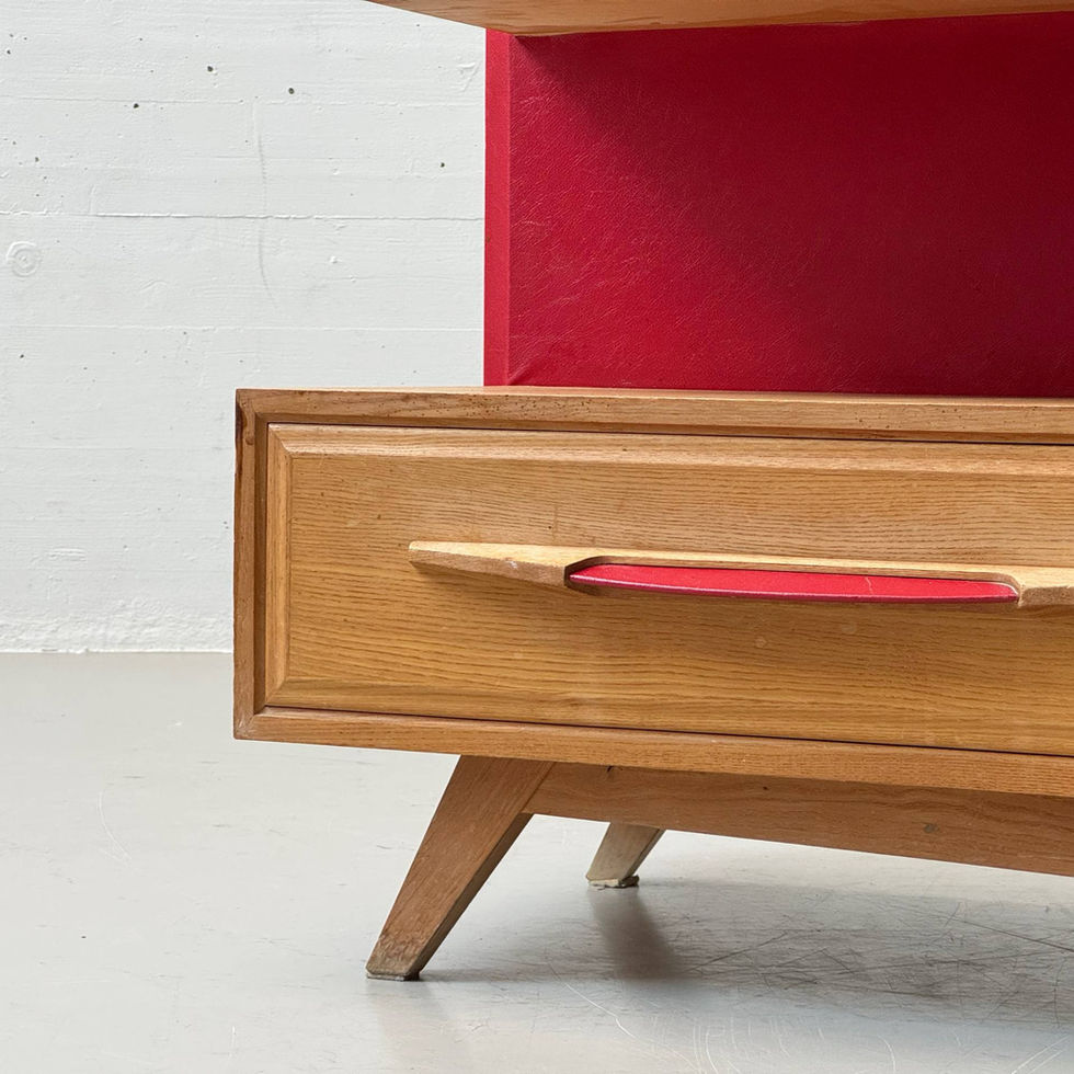 Charakterstarke Wohnwand aus der Schweizer Produktion Corta Multiform, gefertigt in den 1950er Jahren. Der Korpus aus warm gemasertem Eschenholz steht in spannendem Kontrast zur markanten, rot ausgeführten Rückwand, die dem Möbel eine aussergewöhnliche Tiefe und grafische Präsenz verleiht. Die klare Gliederung mit vier Türen im oberen Bereich und zwei grosszügigen Schubladen im unteren Teil folgt der funktionalen Formensprache. Besonders prägnant sind die fein gearbeiteten Griffe, die mit rotem Kunstleder bezogen sind und die Farbgebung der Rückwand elegant aufnehmen. Die leicht ausgestellten, konisch zulaufenden Füsse verleihen dem Möbel eine schwebende Leichtigkeit, während die offene Mittelzone zusätzlichen Raum für Präsentation oder Nutzung bietet. Innen überzeugt die Wohnwand mit variabel einstellbaren Tablaren und grosszügigem Stauraum – ein vielseitiges Stück zwischen Sideboard und Vitrinenlösung.