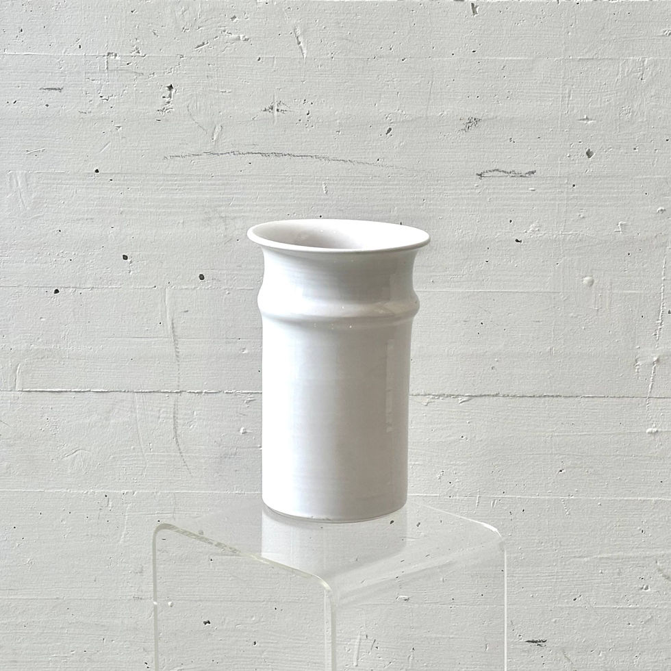 Diese elegante Porzellanvase überzeugt durch ihre klare, reduzierte Formensprache und eine ruhige, fast skulpturale Präsenz. Der zylindrische Korpus wird durch einen sanft eingezogenen Hals mit leicht ausgestelltem Rand akzentuiert, wodurch eine harmonische Silhouette entsteht, die sowohl klassisch als auch modern wirkt. Die hochglänzende, reinweisse Glasur unterstreicht die formale Klarheit und lässt das Licht weich über die Oberfläche fliessen. Besonders reizvoll ist die bewusst zurückhaltende Gestaltung, die der Vase eine vielseitige Einsetzbarkeit verleiht – ob als puristisches Einzelobjekt oder in Kombination mit Zweigen und floralen Arrangements. Die Qualität der Ausführung sowie die präzise Verarbeitung sind typisch für die traditionsreiche Porzellanmanufaktur Hutschenreuther aus Selb in Bayern, was sich auch in der Bodenmarke widerspiegelt. Ein stilvolles Objekt, das sich müelos in unterschiedlichste Interieurs einfügt und durch seine schlichte Eleganz zeitlos wirkt.
